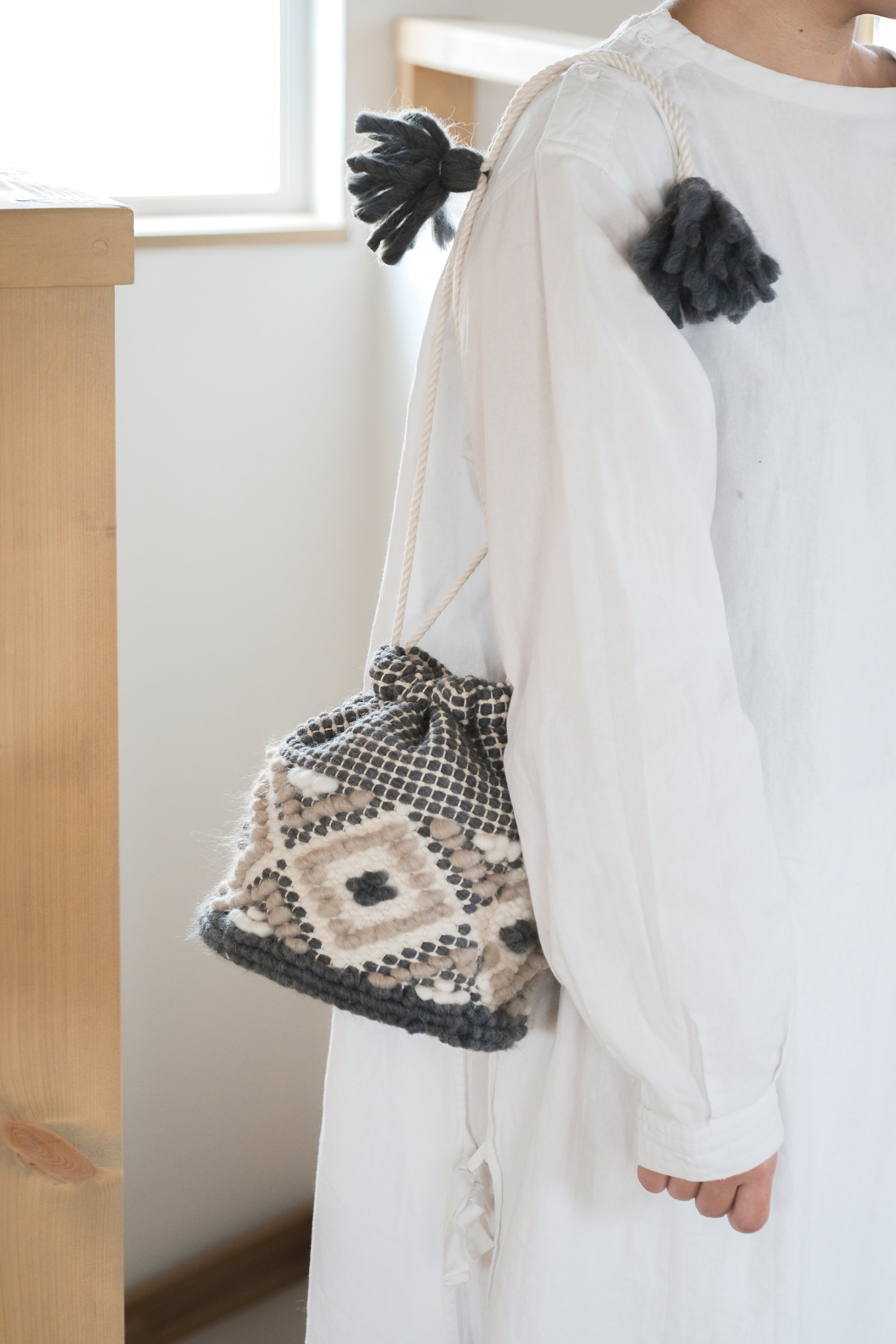 ぽこぽこしたメリノウールの柔らかいテクスチャーとオリジナルの幾何学模様がパッと目を引く手織のキンチャクバック。